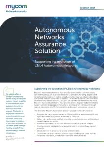 Mycom’s Autonomous Networks Assurance Solution provides Communications Service Providers (CSPs) automated detection, correlation, ticketing, dispatch and remediation of problems in mobile, broadband and enterprise networks to reduce operational complexity and time-to-market. The Solution supports CSPs’ evolution of Autonomous Networks from L2 to L3/L4. Delivered on-demand from the cloud, Mycom’s Autonomous Networks Assurance Solutions are designed and architected to support complex disaggregated networks to minimize errors introduced through manual operations, simplify the operations and support autonomous networks.